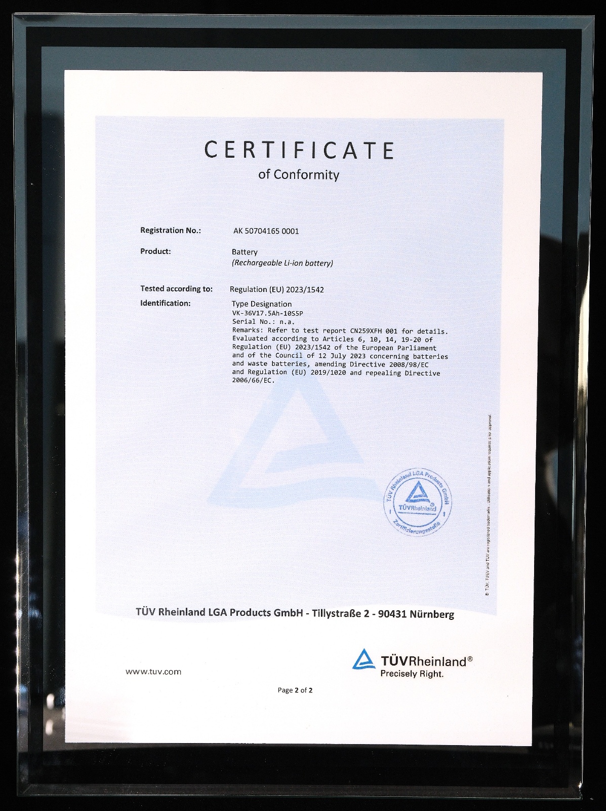 2025年11月28日,德國萊茵TüV大中華區(qū)(以下簡稱“TüV萊茵”)在維科技術小動力事業(yè)部隆重頒發(fā)了電動自行車電池歐盟電池法規(guī)(EU)2023/1542符合性證書。此次認證標志著維科技術的相關電池產品在安全、環(huán)保、可持續(xù)性等方面,已全面滿足歐盟這一嚴苛標準的要求,為維科技術進一步鞏固和拓展歐洲市場提供了強有力的通行證。