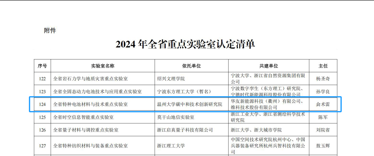 6月3日,浙江省科學技術廳發布了《關于公布2024年全省重點實驗室認定結果的通知》,維科技術以共建單位申報的“全省特種電池材料與技術重點實驗室”成功入選全省重點實驗室名單。